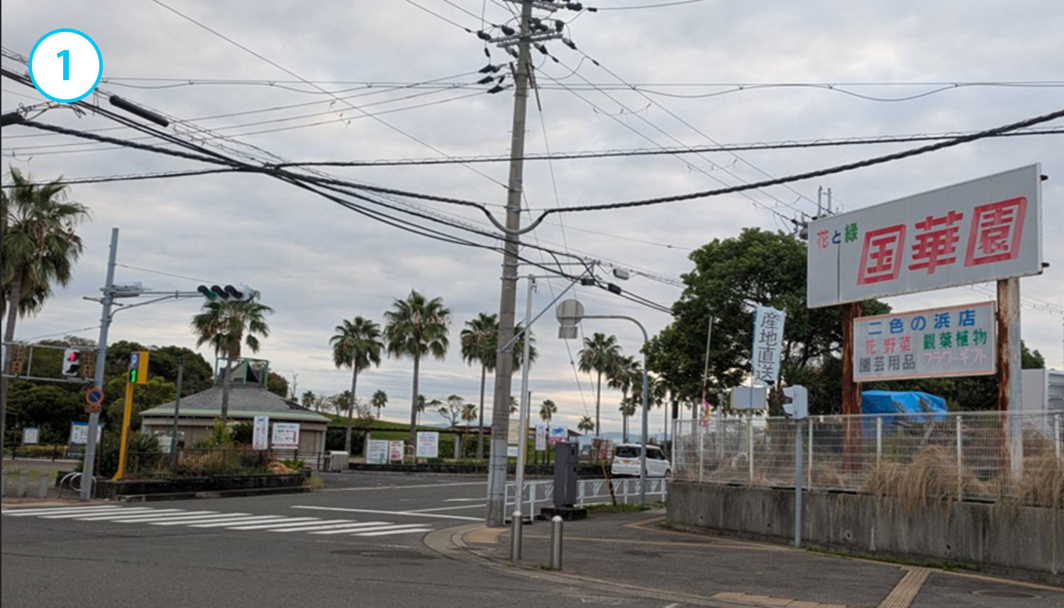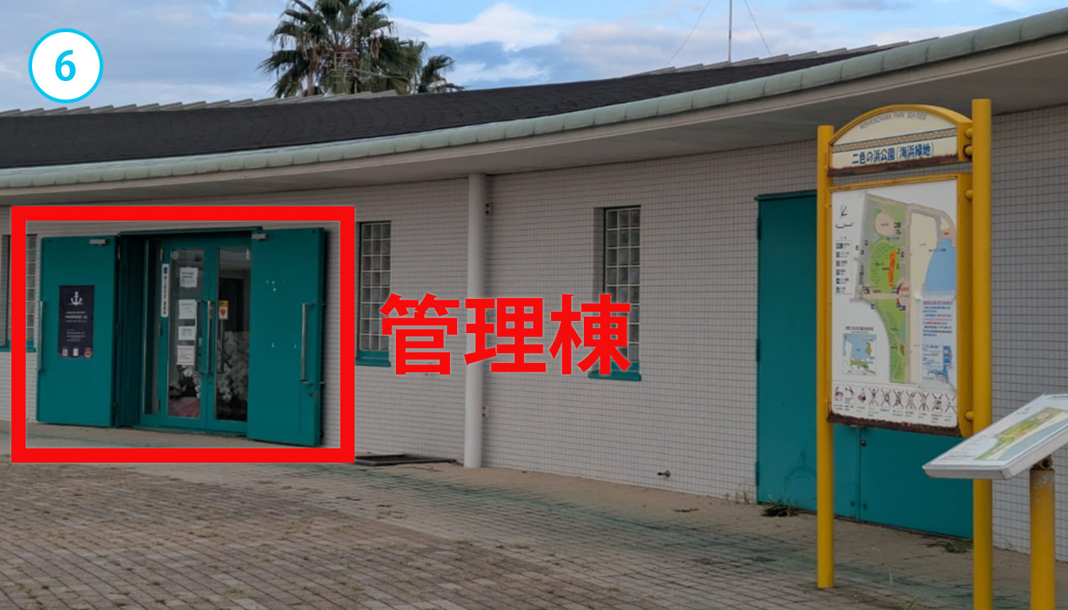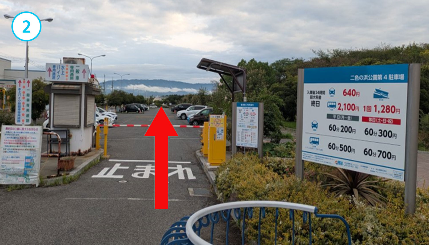 南海線「貝塚駅」を下車。貝塚駅 東出口を出て左方向、バスターミナルへ。水間鉄道バス コスモスライナー「二色海浜緑地公園行き」に乗車、「海浜緑地公園・国華園前」で下車。降り場より右方向に約100m