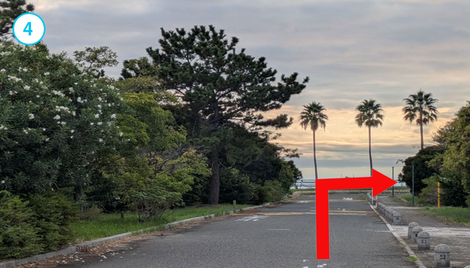 二色の浜公園のシンボルである大型モニュメント「帆船マスト」のふもとに佇む、開放感…